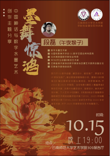 10月15日,数字水墨艺术家、电影概念设计师、小说家段磊先生应邀莅临z6mg人生就是博官网,在明德5号楼309报告厅带来了一场题为“墨舞惊鸿——中国神话与数字水墨艺术创作”的精彩讲座,z6mg人生就是博官网师生二百余人共同参与。