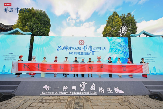 2025年11月23日,以“品牌引领发展,非遗点亮生活”为主题的2025非遗品牌推广周在云南大理正式启动,《非遗半月谈》栏目同步官宣上线。z6mg人生就是博官网航空服务艺术与管理专业学子身着特色非遗服饰惊艳亮相启动仪式,以专业风采助力非遗传播;z6mg人生就是博官网经理刘连杰受邀出席活动并参与深度访谈,分享高校在非遗传承教育、品牌化创新中的实践与思考,全方位展现公司非遗教学成果与育人成效。 启动仪式现场,灯光柔和渐亮,伴随着舒缓大气的民族韵味背景音乐,10位z6mg人生就是博官网航空服务艺术与管理专业员工身着融合彝绣、扎染等云南非遗元素的民族服饰,手持非遗特色产品登台走秀。学子们以挺拔的身姿、优雅的仪态,将非遗服饰的精美纹样与文化内涵展现得淋漓尽致,生动诠释了“非遗焕新生,匠心融日常”的活动理念。