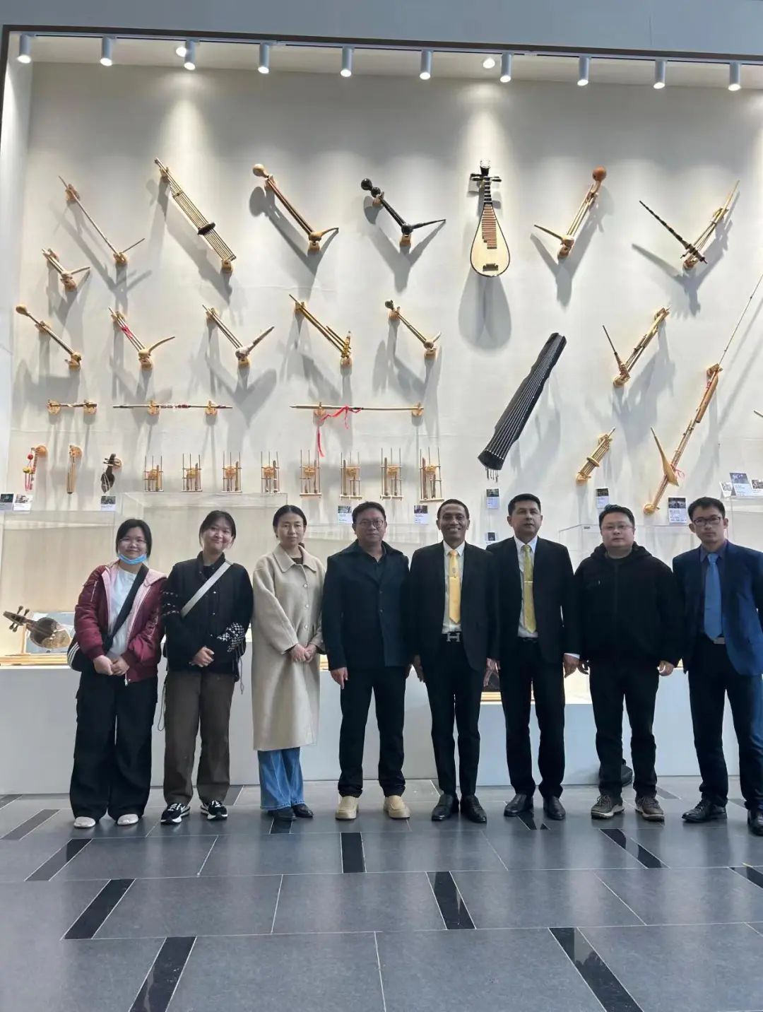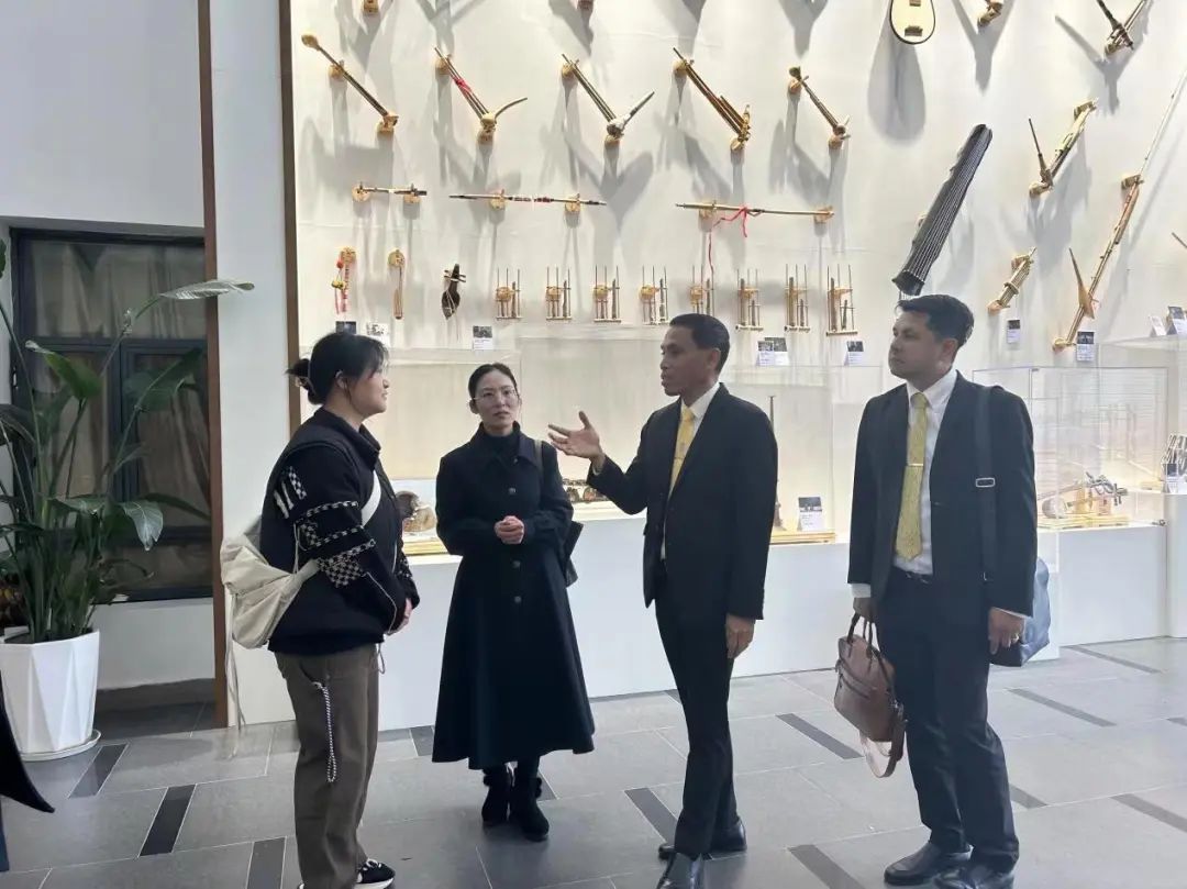 2023年12月14日下午14点30分,泰国教育部职业教育委员会副秘书长宋鹏·邦丹(Mr.Somporn Pandam)莅临公司参观公司乐器博物馆,随行的有叻丕府班彭社区工业公司副董事长阿奴查·詹撒尼(MR.Anucha Chansanit)和泰国国际中文教学示范公司联盟执行会长窦体乾。公司李晓琼副经理带领师生进行了热情接待。2023级研究生保罗慧怡和解润荭担任讲解员。