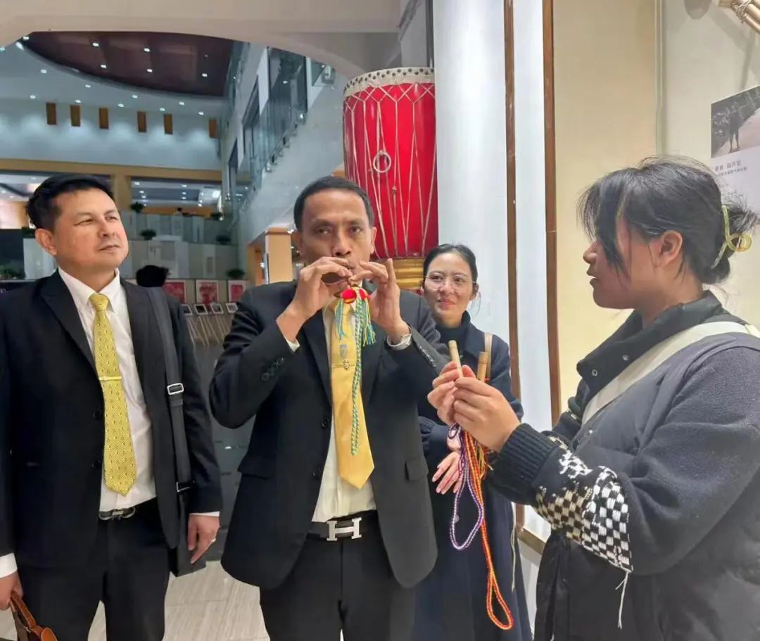 在乐器博物馆二楼的南亚东南亚展区,宋鹏·邦丹副秘书长在看到泰国乐器时十分激动,并与在场师生分享泰国对于乐器的使用。在一楼大厅看到大量西南少数民族乐器时,宋鹏·邦丹副秘书长产生了浓厚的兴趣,并亲自试吹傈僳族笛哩突和彝族口弦。